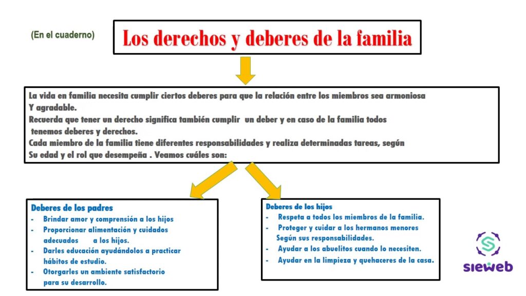 Entre los deberes de los niños en la familia se encuentra el respeto hacia los padres y hermanos, el cuidado de los espacios compartidos, la colaboración en las tareas del hogar y el estudio y la educación como prioridad. Al mismo tiempo, los niños tienen derechos como el derecho a ser escuchados, a ser protegidos de cualquier tipo de violencia o maltrato, a tener acceso a una educación de calidad y a un ambiente emocionalmente estable. Es importante que los padres y demás miembros de la familia tomen en cuenta estos deberes y derechos para fomentar un ambiente de armonía y respeto en el hogar.